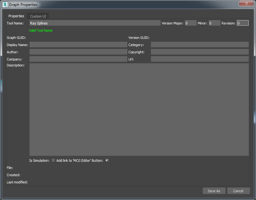 Set the Tool Name to "Ray Splines" in the Graph Properties dialog, and press Save As.