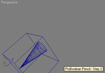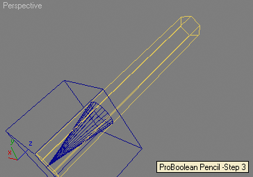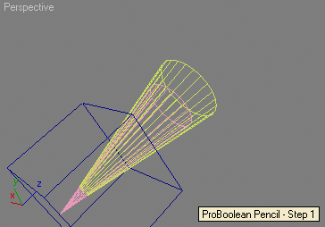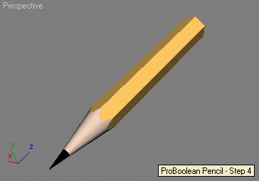 --Creating a Pencil using multiple boolean subtractions --of a box, two cones and a cylinder: --Step 1: create a box and two cones, assign materials: theBox = box height:50 width:50 length:50 pos:[0,0,-2] theCone1 = cone radius1:3 radius2:20 height:80 heightsegs:1 pos:[0,0,15] theCone2 = cone radius1:0 radius2:15 height:80 heightsegs:1 theCone1.material = standard diffuse:(color 255 220 200) theCone2.material = standard diffuse:black
