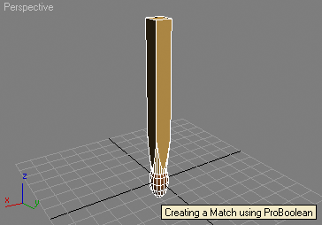 --Creating a match using two consecutive boolean operations between --a box, a cone and a sphere: theBox = box height:100 width:10 length:10--create a box theCone = cone radius1:4 radius2:15 height:110--create a cone theSphere = sphere radius:6--create a sphere xf = xform()--create an XForm modifier addModifier theSphere xf--add the XForm to the sphere xf.gizmo.scale = [1,1,2]--scale the sphere along Z --create an intersection of the box as operand A and the cone as operand B: ProBoolean.createBooleanObject theBox theCone 1 0 0 --assign materials to the box and to the sphere: theBox.material = standard diffuse:(color 255 200 100) theSphere.material = standard diffuse:brown ProBoolean.SetBoolOp theBox 0--set the boolean operation to union ProBoolean.setOperandB theBox theSphere 0 0--add the sphere asnewoperand B