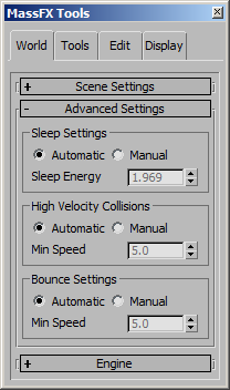 <PhysXPanel>.sleepEnergy Float default: 1.9685 -- floatGet the value of the "Speed Energy" property. It is used when the .sleepThresholdsAutomatic property is set to 1 to determine the energy threshold below which the Rigid Body will go to "sleep" mode and will not be calculated anymore. Available in 3ds Max 2013 and higher.