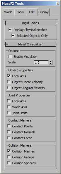 <PhysXPanel>.visualizerScale Float default: 1.0 -- worldUnitsGet the value of the "Scale" spinner. This controls the relative size of the viewport-based indicators, such as axes.