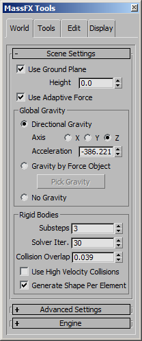 <PhysXPanel>.gravityMode Integer default: 2 -- integerGet the state of the Gravity Mode radio buttons. Available in 3ds Max 2013 and higher.
