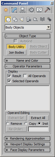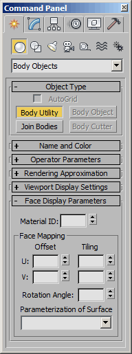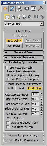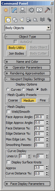 Body_Utility - superclass: GeometryClass; super-superclass:node - 80:0 - classID: #(1481052916, 322005602)The Body_Utility class introduced in 3ds Max 2011 allows the tweaking of the surface representation parameters of multiple Body_Objects at once.