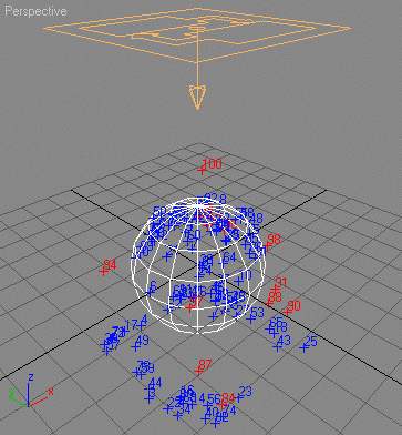 In the sample scene, a Sphere with radius 20 represents the spherical volume tested by the script. The particles either rest on the surface of the sphere, or have passed it and have stopped because of their age outside the sphere.