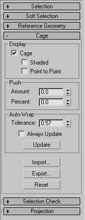 <Projection>.displayCage BooleanClass default: true -- boolean; Display_Cage Get/Set the state of the "Cage" checkbox. When true, the cage will be displayed.