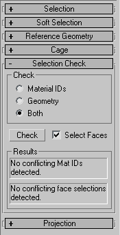 <Projection>.selectionCheckSelFaces BooleanClass default: true -- boolean; Show_Selection_Check_Faces Get/Set the state of the "Selected Faces" checkbox. When true, only selected faces will be checked.