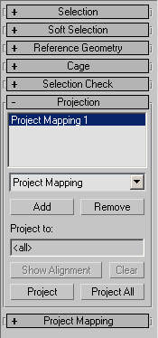 The Projection modifier lets yout project data such as mapping coordinates, vertex colors and Material IDs from one geometry object onto another. It is typically used in conjunction with Normal Mapping, but has a much larger number of possible applications.