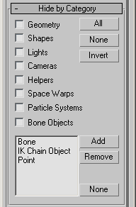 hideByCategory.nonrenderables Get/set whether to hide non-renderable objects, equivalent to the Show Renderable Only setting on the Hide By Category rollout.
