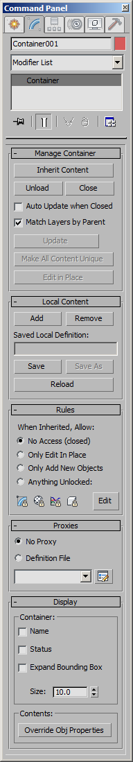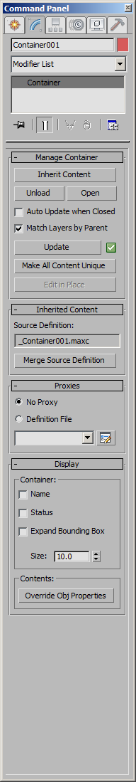 Container - superclass: helper; super-superclass:node - 10:0 - classID: #(1848947859, -473657791) In 3ds Max 2010 and higher, a Container is a helper object in a scene that is used to group self-contained content together and manage, publish, and inherit the content including the ability to unload the content objects from memory.
