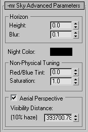 <mr_Sky>.AerialPerspective Float default: 393701.0 -- animatable; float; Aerial_Perspective Get/set the Aerial Perspective value.