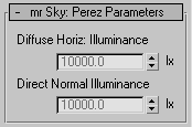 <mr_Sky>.PerezDiffuseHorizIlluminance Float default: 10000.0 -- float; Perez_Diffuse_Horiz__Illuminance Available in 3ds Max 2009 and higher.