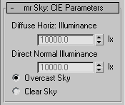 <mr_Sky>.CIEDirectNormalIlluminance Float default: 10000.0 -- float; CIE_Direct_Normal_Illuminance Get/set the CIE Direct Normal Illuminance value.