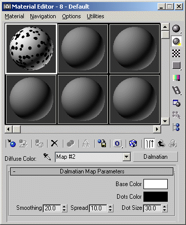 )--end pluginEvaluate the script. A new Dalmatian map appears in the Material/Map browser. You can use it anywhere a regular texture map is used. The default look is like of a typical Dalmatian dog’s skin.