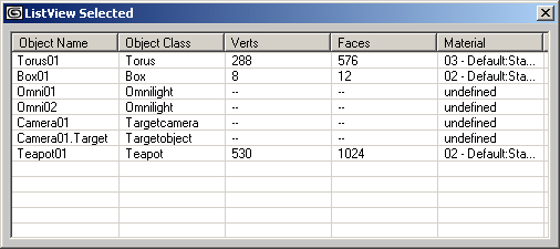 Select some scene objects and press the button/select the menu item or press the keyboard shortcut - a new dialog with a listView ActiveX control displaying the name, class, vertex and face count and assigned material should appear.