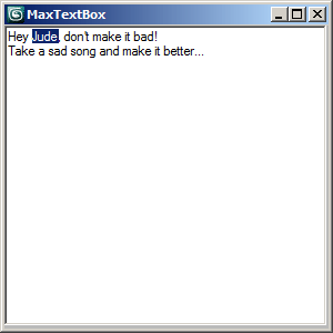 theFrm = dotNetObject "MaxCustomControls.MaxForm" theBox = dotNetObject "MaxCustomControls.MaxTextBox" theBox.width = 290 theBox.height = 270 theBox.Multiline = true theBox.Text = "Hey Jude, don't make it bad!\r\nTake a sad song and make it better..." theBox.SelectionStart = 4 theBox.SelectionLength = 4 theFrm.controls.add theBox theFrm.topmost = true theFrm.text = "MaxTextBox" thePtr = DotNetObject "System.IntPtr" (windows.getMAXHWND()) theHwnd = (dotNetObject "System.Windows.Forms.NativeWindow").FromHandle thePtr theFrm.Show(theHwnd)