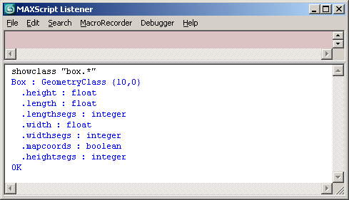 Notice that you can use the "*" character as a wildcard to see all box parameters. If you had entered showClass "box*.*," MAXScript would have listed all of the parameters of theBox and the BoxGizmo classes.