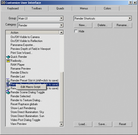 In 3ds Max 4, a unified ActionItems system was introduced which allows MacroScripts to appear in all four major areas of the customization dialog - Keyboard Shortcuts, Toolbars, Menus and QuadMenus.