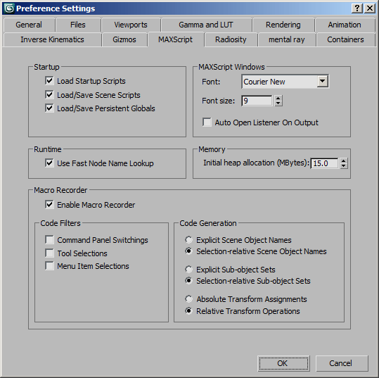 These settings can also be changed or set by editing the [MAXScript] section of the 3dsmax.ini file.