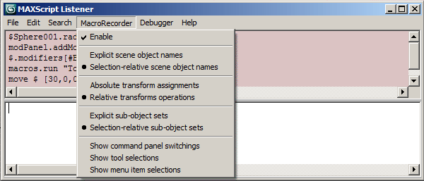 When Enable is selected the Macro Recorder will generate MAXScript commands.