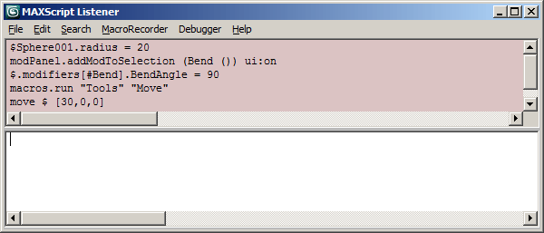 In the Create and Modify panels, Macro Recorder output will be generated if the object or modifier can be created by MAXScript.