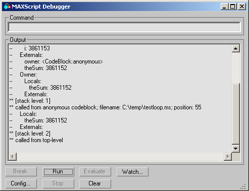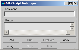 The Config button opens the modal MAXScript Debugger Parameters dialog which can be used to customize the Debugger settings and toggle certain features on and off.