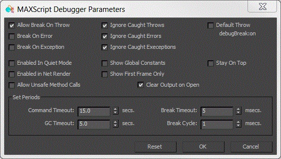 Break Timeout (msecs.) - this value specifies how long the Debugger should try to break the 3ds Max thread. Default is 5 milliseconds.