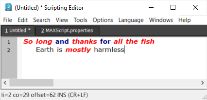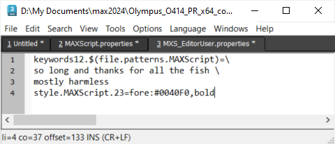 The MAXScript-specific language settings of the Tabbed Scripting Editor introduced in 3ds Max 2008 can be customized by editing the file MAXScript.properties located in the 3ds Max root folder to include user-defined keywords that are not part of the MAXScript language.