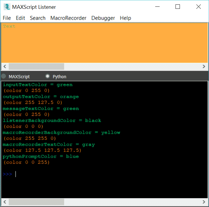 pythonPromptColorGets or sets the color of the prompt in the Scripting Listener when it is in Python language mode. Available in 3ds Max 2020 and higher.