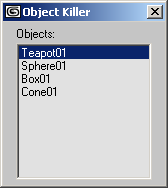 rollout objectKiller "Object Killer" ( --Define a list box, collect the names of all scene objects and --assign them to the items array listbox objectToKill "Objects:" items:(for o in objects collect o.name) --If the user clicked a name on the list, --get the name from the .items array by index --then get the node by name and select it. --COMPARE to the doubleClicked handler below which performs a --similar task using a slightly different approach. --Both ways are valid! on objectToKill selected nameIndex do select (getNodeByName objectToKill.items[nameIndex]) on objectToKill doubleClicked itm do ( --Get node using its name from the .selected property and delete it: delete (getNodeByName objectToKill.selected) --Get the items into a temporary array: temp = objectToKill.items --Delete the doubleckicked item by index --the local variable itm contains the index! deleteItem temp itm --Assign the result back to the items array: objectToKill.items = temp ) ) createDialog objectKiller--create a dialog from the rolloutParameters