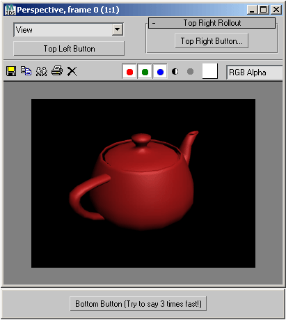 ( global MyFirstVFBLayout --the function needs to be global fn MyFirstVFBLayout VFB_Interface = ( --will be called by the callback --if the window is a Rendered Frame Window, if VFB_Interface.IsFramebuffer do ( --set all borders to 0 to save screen estate VFB_Interface.SetMetric #horzMarginLeft 0 VFB_Interface.SetMetric #horzMarginCenter 0 VFB_Interface.SetMetric #horzMarginRight 0 VFB_Interface.SetMetric #vertMarginTop 0 VFB_Interface.SetMetric #vertMarginCenter 0 VFB_Interface.SetMetric #vertMarginBottom 0 VFB_Interface.SetMetric #minClientWidth 320 VFB_Interface.SetMetric #minClientHeight 240 --Definesome stand-in rollouts to display in the three panels: rollout theTopLeftRollout "Top Left Rollout" width:200 height:45 ( dropdownlist ddl_topLeft items:#("View","Region","Crop") width:160 button btn_topLeft "Top Left Button" width:160 ) rollout theTopRightRollout "Top Right Rollout" width:200 height:50( button btn_topLeft"Top Right Button...") rollout theBottomRollout "Bottom Rollout" width:200 height:22( button btn_bottomButton "Bottom Button (Try to say 3 times fast!)" ) --Initialize the top left panel to a size and --get its RolloutFloater value back: theTopLeftFloater = VFB_Interface.InitRolloutWindow #TopLeft 200 60 --Add the rollout to the RolloutFloater without borders and tile bar: addRollout theTopLeftRollout theTopLeftFloater border:false --and enable the visibility of the top left panel: VFB_Interface.SetRolloutWindowVisible #TopLeft true --Initialize the top right panel to a size and --get its RolloutFloater value back: theTopRightFloater = VFB_Interface.InitRolloutWindow #TopRight 200 60 --add the rollout to the RolloutFloater WITH borders and tile bar: addRollout theTopRightRollout theTopRightFloater border:true --and enable the visibility of the top left panel: VFB_Interface.SetRolloutWindowVisible #TopRight true --Initialize the bottom panel to a size and --get its RolloutFloater value back: theBottomFloater = VFB_Interface.InitRolloutWindow #Bottom 400 35 --add the rollout to the RolloutFloater without borders and tile bar: addRollout theBottomRollout theBottomFloater border:false --and enable the visibility of the top left panel: VFB_Interface.SetRolloutWindowVisible #Bottom true VFB_Interface.InitLayout() --finally, initialize the new layout )--end if )--end fn --unregister any related callbacks: callbacks.removeScripts #preImageViewerDisplay --register a pre-image viewer display callback callbacks.addScript #preImageViewerDisplay "MyFirstVFBLayout (callbacks.notificationParam())" id:#ResizeVFBPanels )--end script
