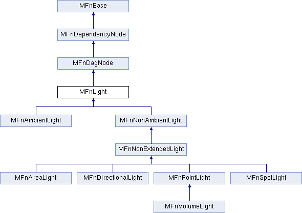 MFnLight allows the creation and manipulation of dependency graph nodes representing lights. This is the top level of a hierarchy of light node function sets. It permits manipulation of the attributes common to all types of lights.