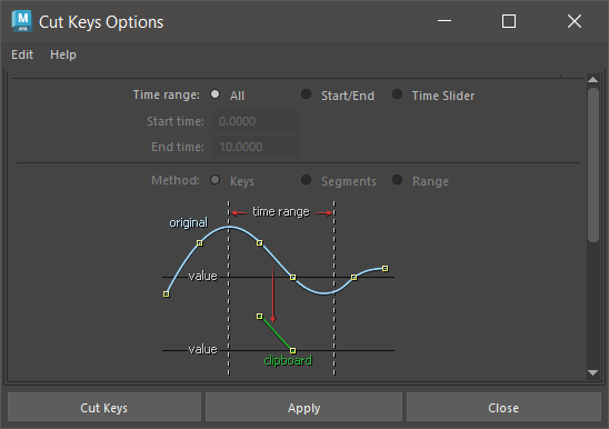 Specifies removing keys within the specified range. If there are keys remaining adjacent to both ends of the deleted area, the animation curve(s) produced will retain the out tangent and in tangent of the key in the cut area.