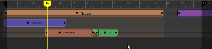 Because you can add timing operators (such as Time Warp and Speed Curve) to a Group clip without affecting the timing of the clips contained within it, there are times when you will want to make edits to the individual clips contained inside. You do not need to remove the clips from the Group clip to edit them, you can create a Local Time Tab for them. See Create Local Time Tabs for Group clips.