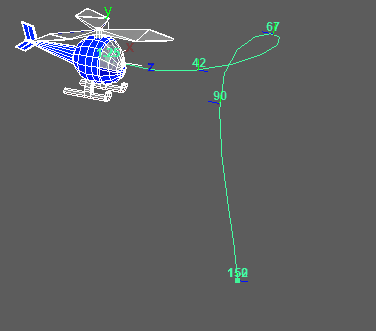 There are times when you will want to reorient the object as it travels along the motion path. In this example, we want to correct the helicopter's flight angle by setting keys for its rotation. You can do this by modifying the corresponding motion object Twist values in the Channel Box, or more intuitively by using the Show Manip Tool to manipulate the object.