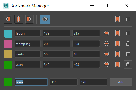 You can also right-click the Time Slider and select Bookmark Manager from the Animation Controls menu. The Bookmark Manager lets you edit all Bookmarks in the scene. See Bookmark Manager for more on editing Bookmarks.