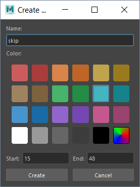 The Create Bookmark window opens. Because you have frames already selected, the Start and End frames in the dialog are already filled. (Alt (Option) + T : Create bookmark) If no frames are selected, the current frame and the frame that follows it are used to create a single frame Bookmark at the current time.