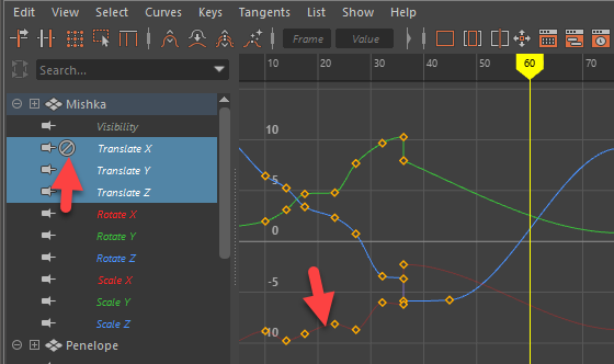 You can view, manipulate, and add keys to the muted curve in the Graph Editor. This is useful when you want to isolate and review specific parts of your animation. When you edit a muted channel or curve in the Graph Editor, the corresponding animation curve updates in the Graph Editor.