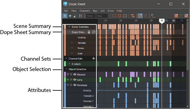The Dope Sheet Summary shows the attributes of all keyed selected objects organized by attribute type. The Dope Sheet Summary is shown by default. To hide it, select Dope Sheet Summary from the Dope Sheet Editor View menu.