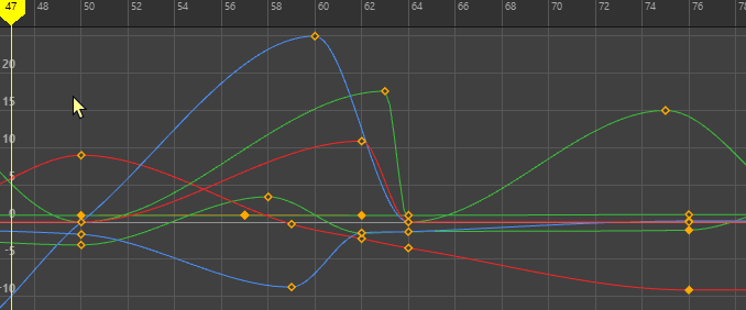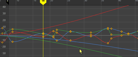 Select the mangled animation curves (for example, Rotate X, Y, and Z), then select . See Graph Editor Curves menu. |
