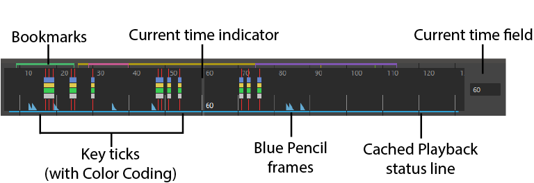 Key Ticks are red (by default) marks in the Time Slider that represent the keyframes you set for the selected object. When keys are selected, they appear white while highlighted blue (see Selecting keys on the Time Slider for an example). Breakdown keys are a special type of key displayed as green marks in the Time Slider.
