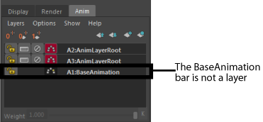 If your workflow involves creating layered animation on top of existing animation curves, you can lock the BaseAnimation bar to prevent those non-layered curves from receiving keys as you keyframe on layers. The Lock button on the BaseAnimation bar lets you protect those non-layered curves. (See also Load existing animation to work with layers in the Animation Layers topic.)