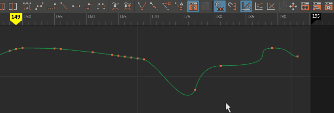 The Graph Editor toolbar contains icons for commonly-used options that are found in the menus and by right-clicking the Graph Editor interface.