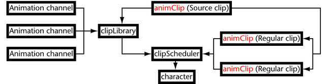 When you create a clip, the animated channels for the character are disconnected from the node or object and are then connected to a node instead. The clip library node manages and keeps track of all the source clips for the character. The clip library and all the regular clips for the character connect to the node. The clip scheduler manages and keeps track of all the regular clips for a character.