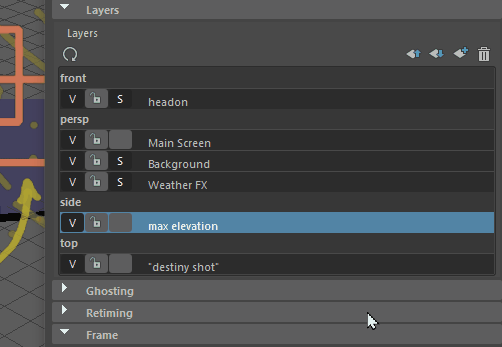 Whenever you draw in the Viewport with Blue Pencil, a frame is created on the current camera view (see Camera Setup for an explanation of how Maya cameras work). But with Blue Pencil you can have multiple layers per camera, which lets you separate different images and stack them.