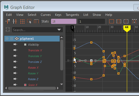 An animation curve is associated with a node in the Outliner portion of the Graph Editor. Selecting a node causes all of its animation curves to be displayed in the graph view.