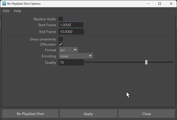 Use the options box next to Re-Playblast Selected Shot to adjust settings before regenerating the clip.