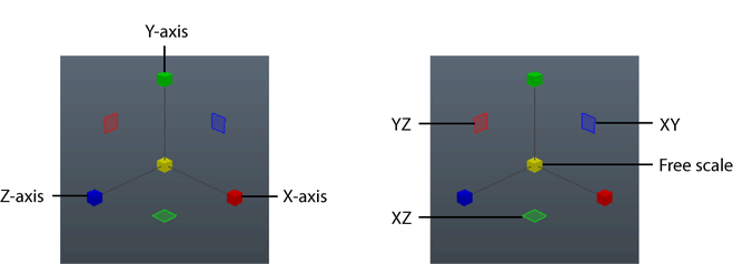 Scaling an object or component changes its size. Scaling happens from the pivot of the object. If you have multiple objects selected, they scale from their common pivot point, which is the last object added to the selection (the key object). For components, the pivot point is located at the center of all selected components.