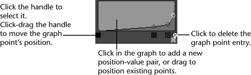 The graph control has handles which you can drag in the graph area to set position-value pairs. The active point has a white border around its handle and icon. Graphs can be used for many types of attributes where value changes per position, including paint effect settings, fluid settings, and so on.