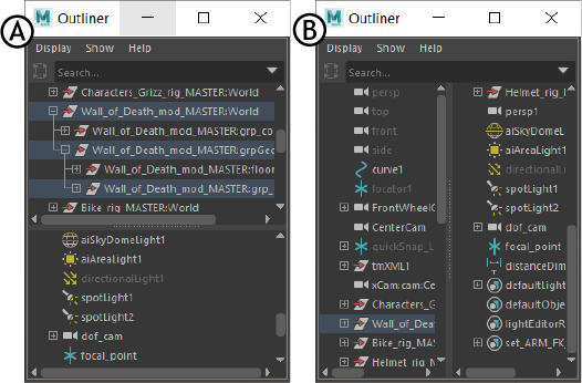 The Display and Show menu commands are also available by right-clicking in an empty space in the Outliner, as well as on most node types. When you right-click on specific node types, you can also access their contextual menus with commands that are not available in the main Display and Show menus. See Outliner contextual menus for information.
