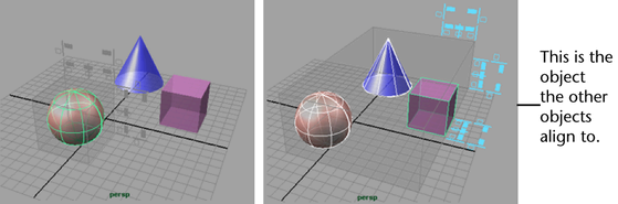 - Select the objects you want to align. The other objects align to the last selected (green) object.